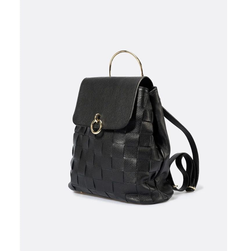Moderner Damen Lederrucksack mit elegantem Webdesign. Veredelt durch einen Metall-Henkel, goldfarbene Details, ein geräumiges Einzelfach und praktische Innentaschen - funktional, edel und stilvoll.