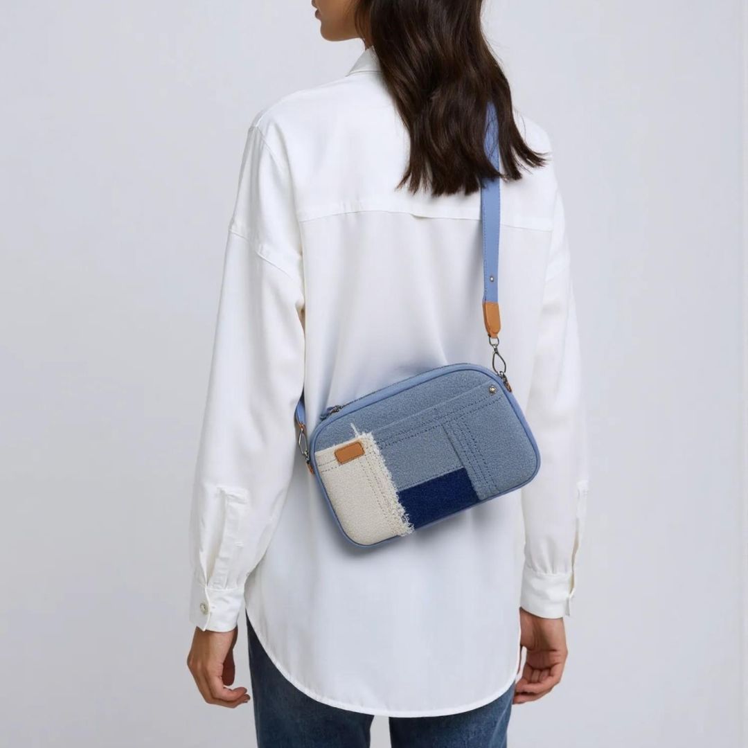 Demin Crossbody Bag - Edle Patches, breiter Gurt und zwei Fächer